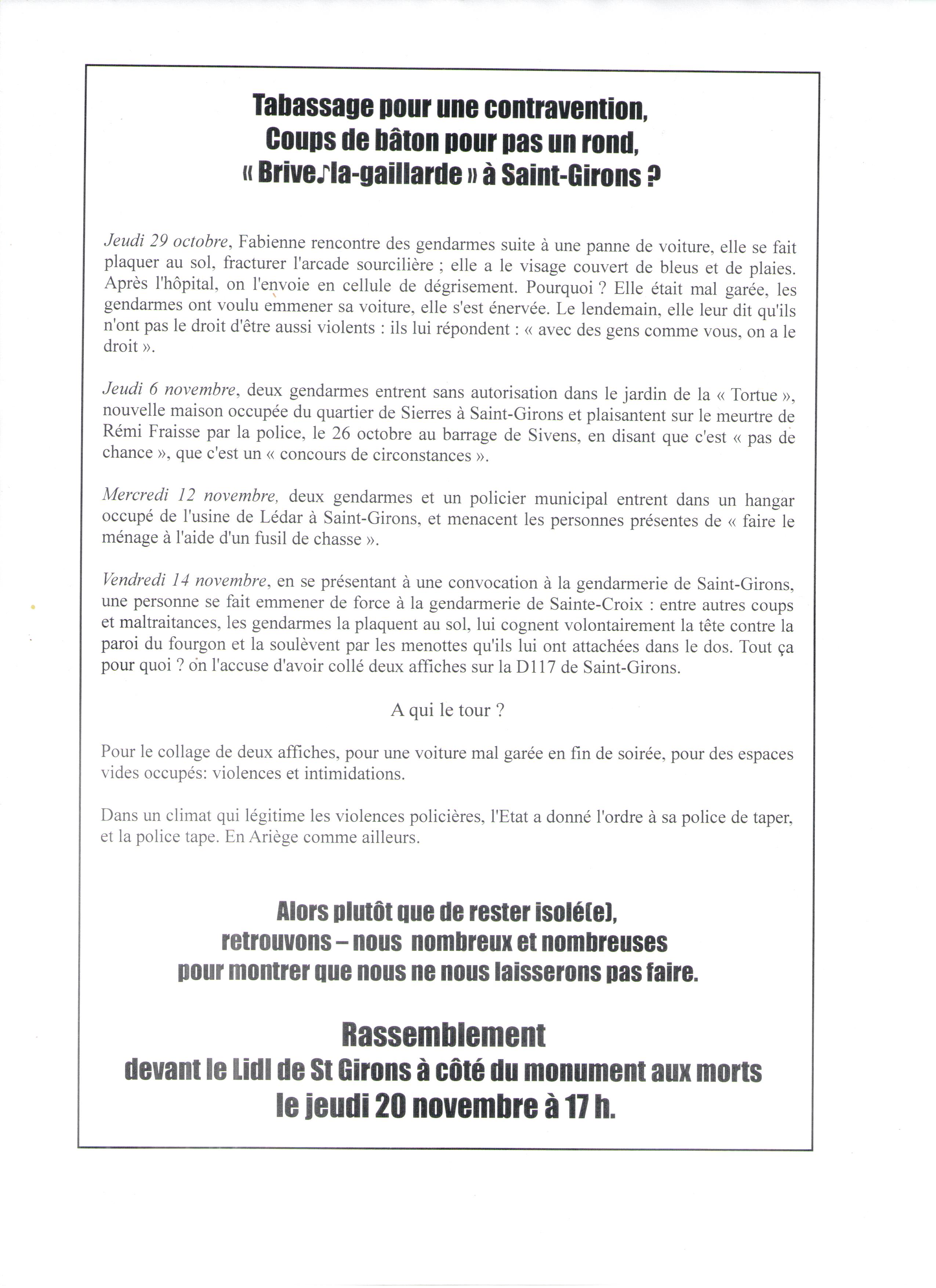 « Brive♪la–gaillarde » à Saint-Girons ? Jeudi 29 octobre, Fabienne rencontre des gendarmes suite à une panne de voiture, elle se fait plaquer au sol, fracturer l’arcade sourcilière ; elle a le visage couvert de bleus et de plaies. Après l’hôpital, on l’envoie en cellule de dégrisement. Pourquoi ? Elle était mal garée, les gendarmes ont voulu emmener sa voiture, elle s’est énervée. Le lendemain, elle leur dit qu’ils n’ont pas le droit d’être aussi violents : ils lui répondent : « avec des gens comme vous, on a le droit ».