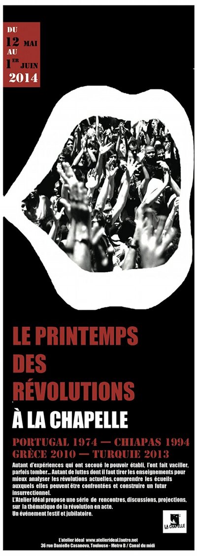 Du 12 mai au 1er juin 2014, l’Atelier Idéal propose une série de rencontres, discussions, projections sur la thématique de la révolution en acte.